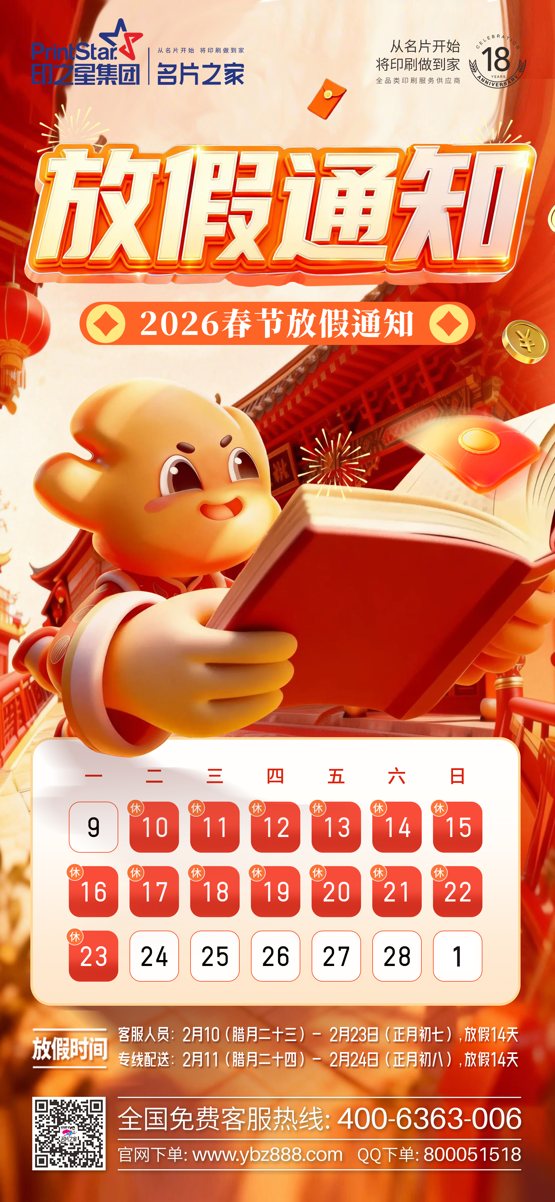 人工客服2月10日-2月23日放假,2月24日正常上班;配送人员2月11日-2月24日放假,2月25日正常上班;