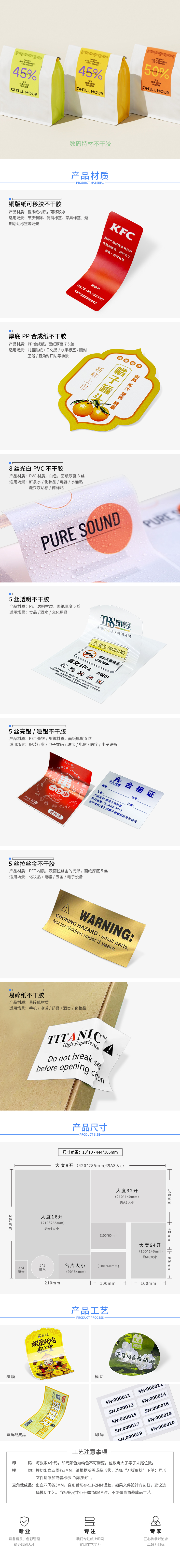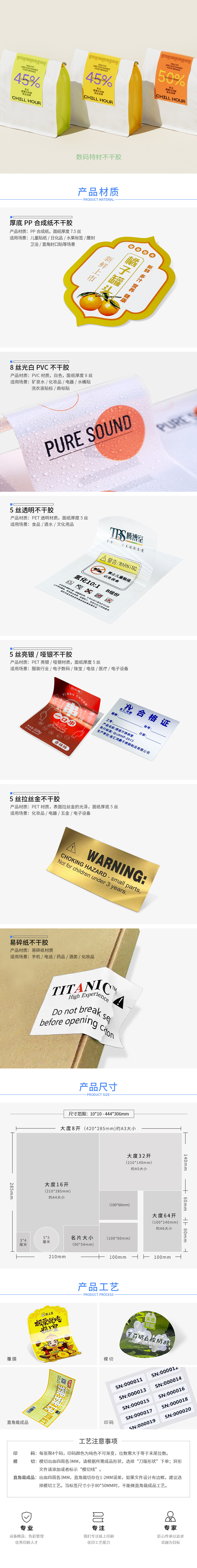 特材不干胶通过使用特殊的材料和制作工艺,为产品提供了独特的标识解决方案。这些标签不仅在功能上满足了耐用性和识别性的需求,而且视觉上也提供了高端和专业的品牌形象。