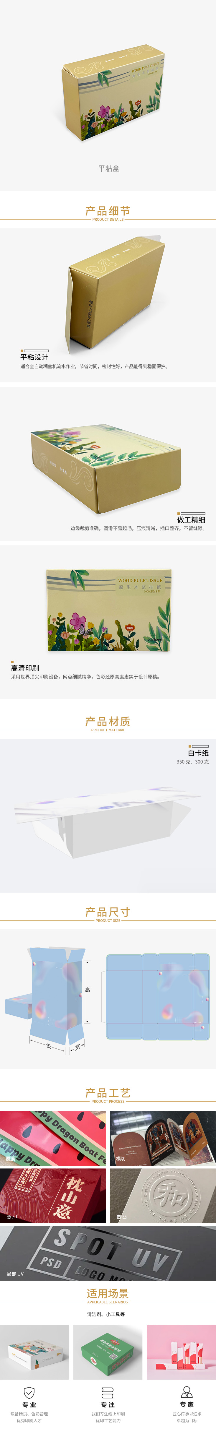 平粘盒为两侧粘合式封口,密封性好,多用于小食品、药品以及纸巾的包装,一但拆开,无法重复使用或开启。