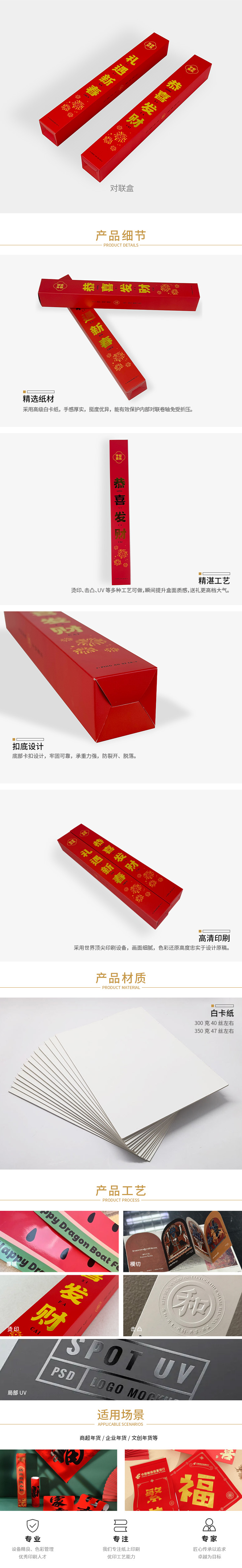 对联盒是专用于封装春联、福字等年节产品的高端包装,以白卡纸为基材,通过印刷、覆膜、模切等工艺制成,兼顾品牌展示与运输保护,是春节文创、企业年礼的“门面包装”。