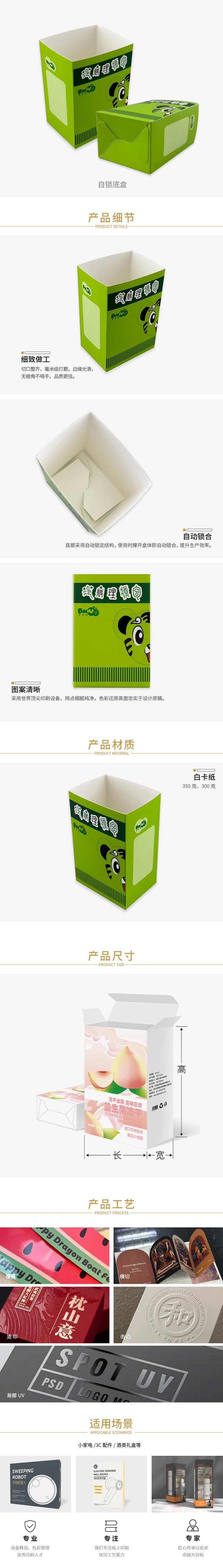自锁底盒是一种折叠纸盒底部结构,其盒底由四片预先模切并压痕的摇翼组成。当盒体从压扁状态展开时,底部摇翼通过“交叉-插扣-自锁”动作自动咬合成型,非常牢固承重力强。