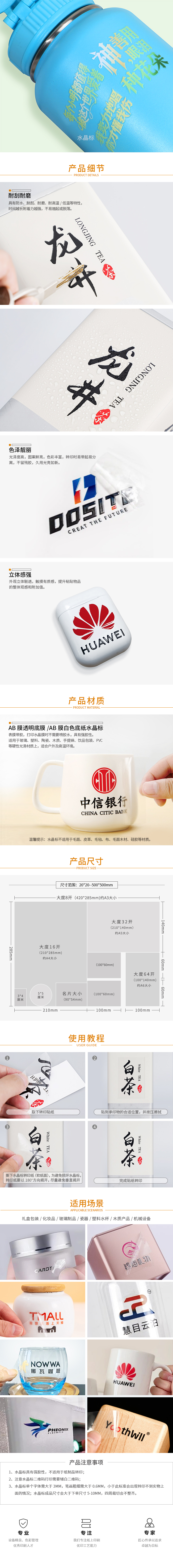 水晶标也叫UV转印贴纸,是通过将胶水、白墨、光油等材料一层层堆叠在离型纸张上印刷成各式图案,然后覆盖转移贴膜,利用转移贴膜将图案转印于物品表面。它的外观立体剔透,形如水晶,因此得名。